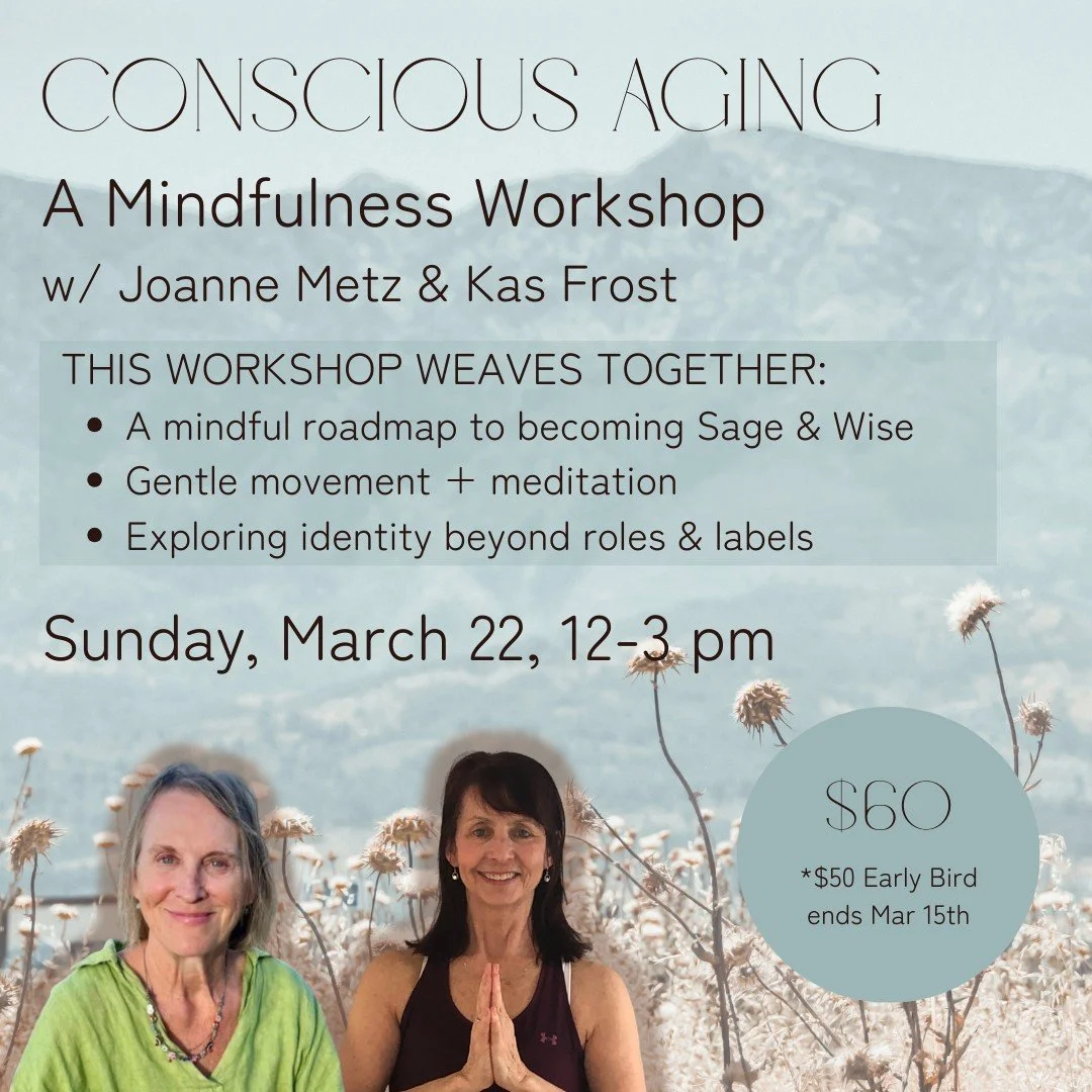 The afternoon with Kas and Joanne will bring mindful excursion into what it means to navigate the path of aging with awareness, intention and acceptance.